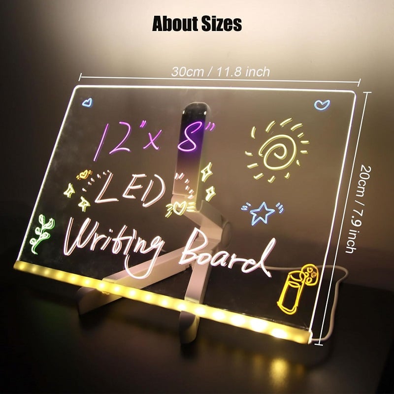The dry erase board with light up stand is equipped with an angle-adjustable tripod, the dry erase board can be placed at a suitable angle. Modify width and tilt to your preferences, Add unique charm to your desktop, it also can put the phone. And the triangular bracket can be fully folded, saving space, flexible handling and stable placed.